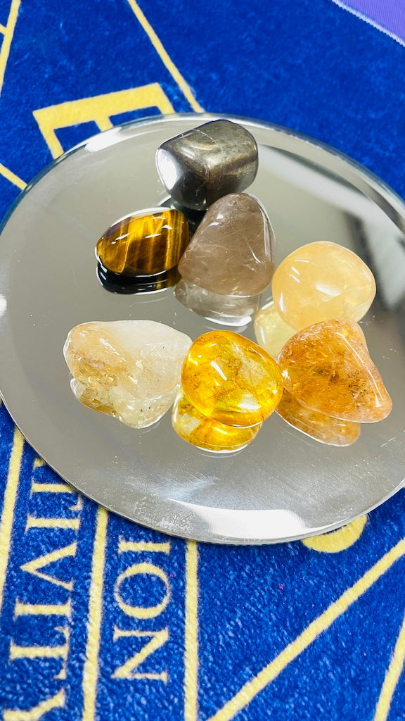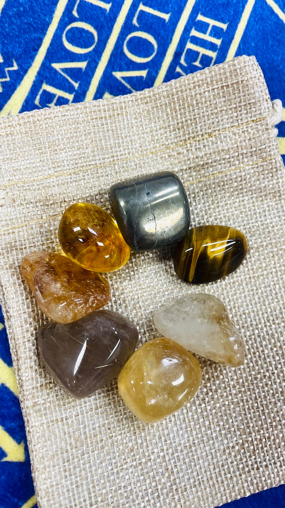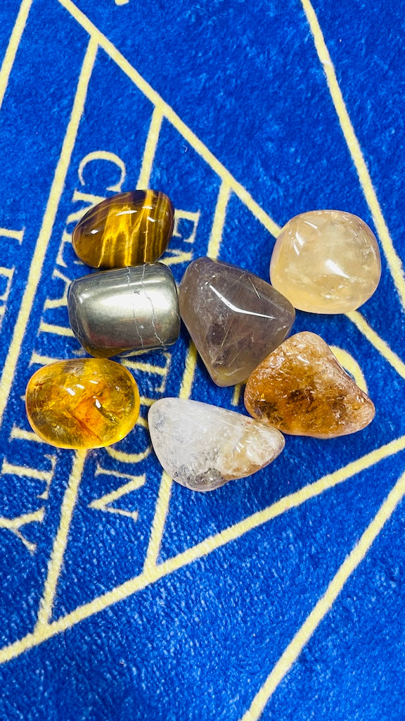 クリスタルはゴールドの波動のものがいくつかあります。どれも希少価値の高いもので通常のタンブルストーンより少しお高めになり、集めるのが難しいのですが、今回アクエリアスクリエーションで7つのゴールドの波動を持つタンブルを集めてセットにしました。